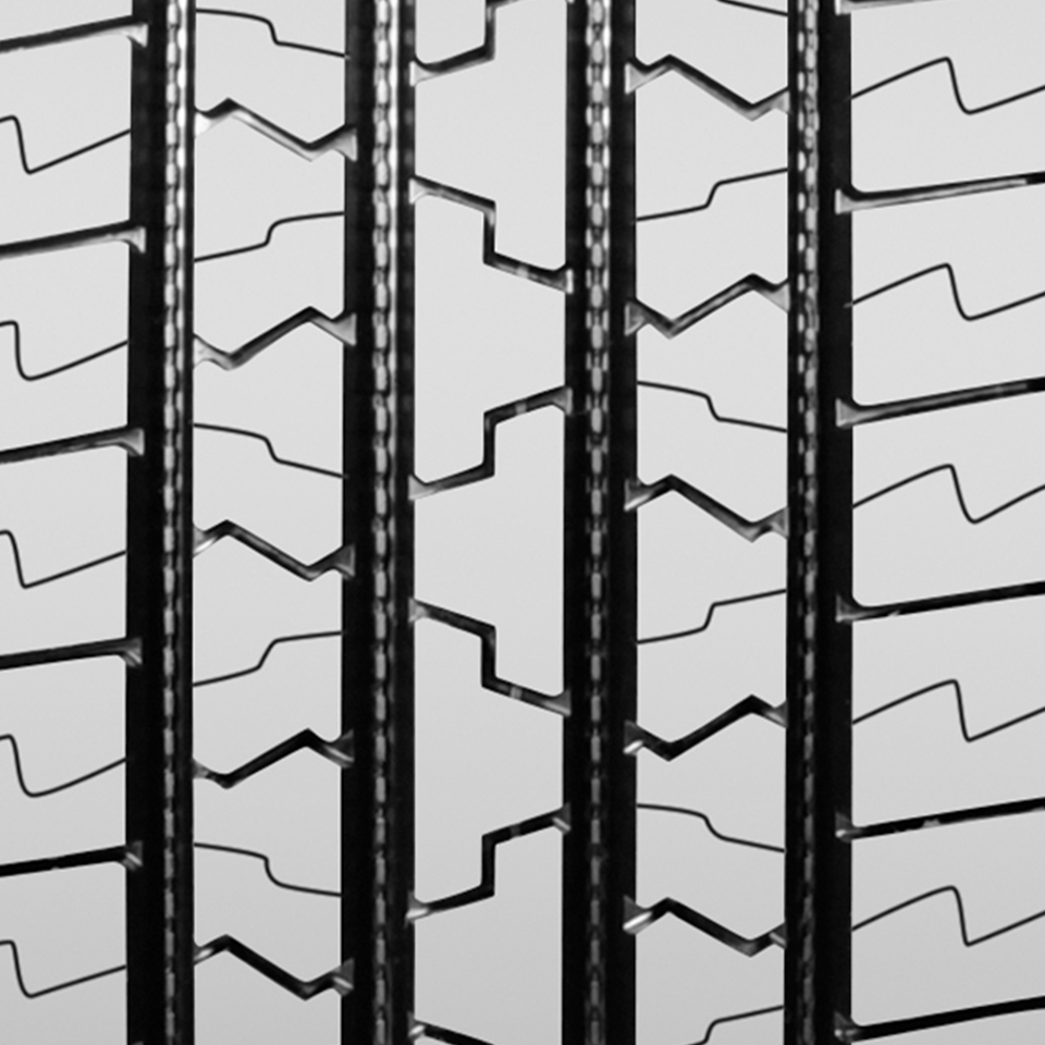 The interlocking shoulder and sipe structure distributes stress evenly across the tread, reducing irregular wear patterns while ensuring stable handling in both loaded and unloaded conditions.