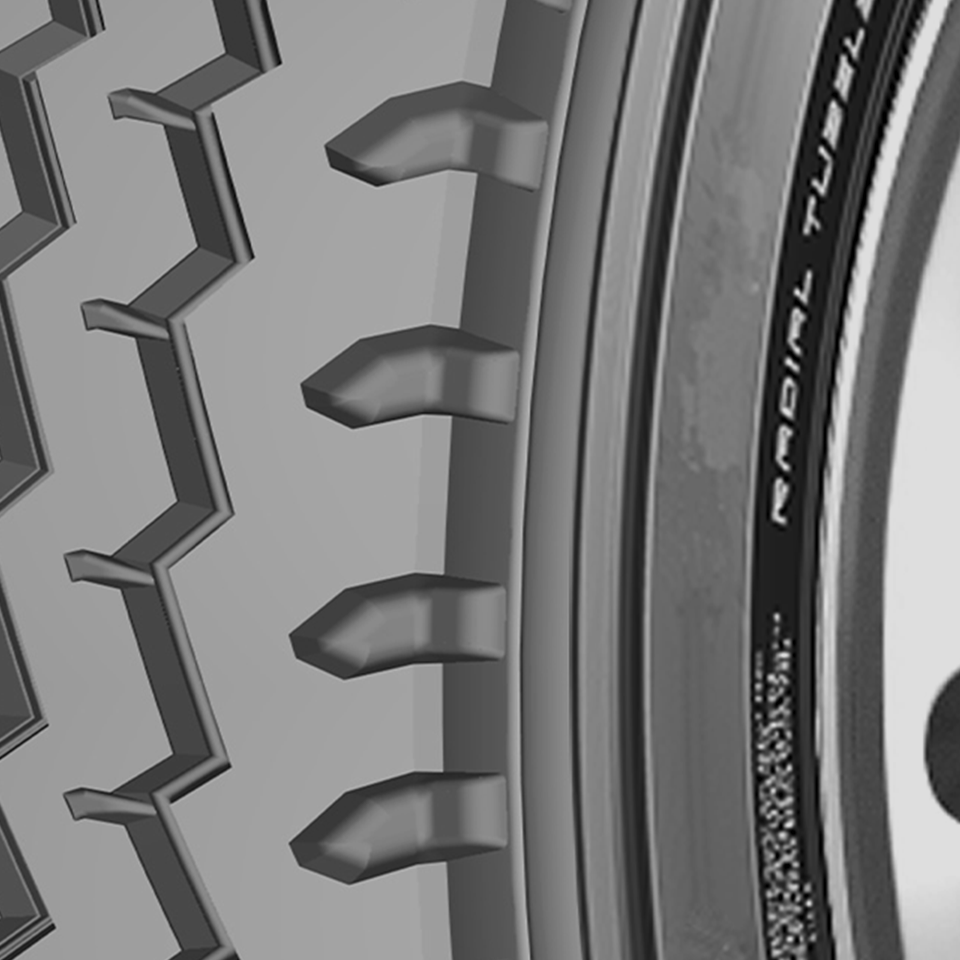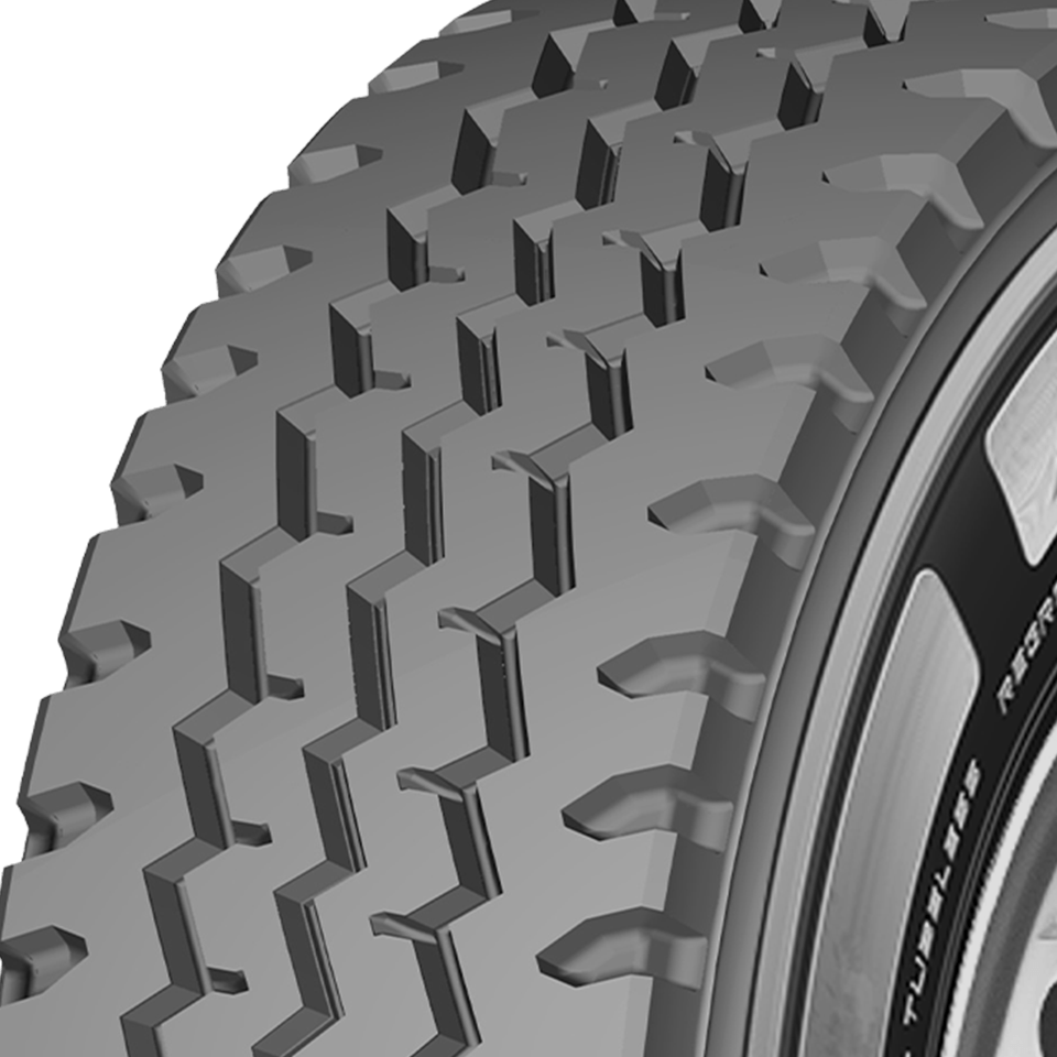 Suited for long haul roads, reinforced housing boosts toughness and refurbishability, 3D tread enhances...